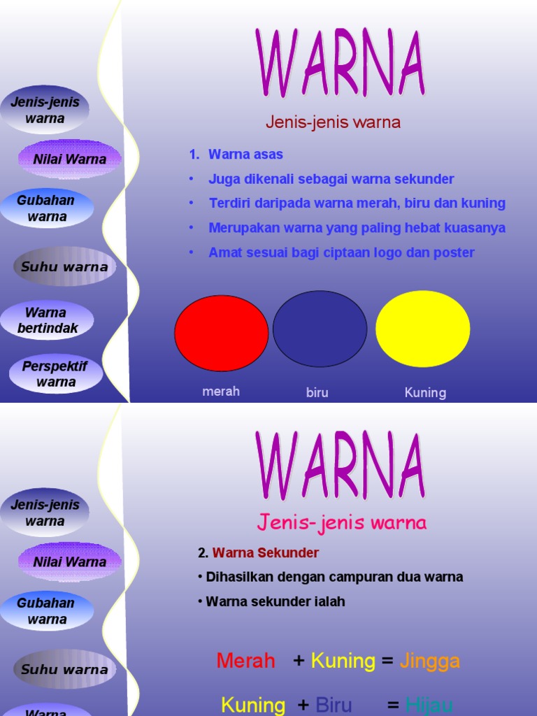 Warna asas Juga dikenali sebagai warna sekunder Terdiri daripada warna merah biru dan kuning Merupakan warna yang paling hebat kuasanya Amat sesuai bagi ciptaan logo dan poster Suhu warna Warna bertindak Perspektif warna merah biru Kuning. Merah hijau b. Home Hantaran Bertema Warna Biru Kuning.